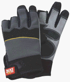 Usage for carpentry and framing. Thumb, index finger, and middle fingerless design. Grey color, synthetic palm with black color synthetic palm reinforcement. EVA palm padding and knuckle strap on back. Solid color polyester spandex back and terry cloth ou