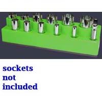 3/8 In Drive Impact Deep Socket Organizer w/ Magnetic Base - Neon Green 12 hole design for semi-deep & deep chrome or impact sockets. Accommodates 3/8 thru 3/4 SAE. Magnetic base holds tools in holder & holder to work surface. Strong enough to hold upside down. Magnetic material is non-transferable. Magnetic material will not magnetize tools or damage on-board automotive computers & other related circuitry. Fuel/oil resistant non-stick high impact plastic. Fits most tool boxes & drawers. Easily tranferable from tool drawer to work area.