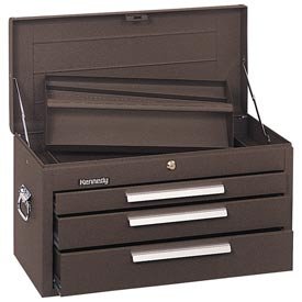 Kennedy 26" 3-Drawer Mechanics Chest w/ Tray - Brown Kennedy 3-Drawer Mechanics Chest is made of heavy gauge steel with a powder coat finish. Folding steel handles for lifting. Reinforced clam shell lid with hinges allows full access to top compartment. Aluminum drawer pull handles. Tubular lock secures all drawers. Includes snap-in friction drawer slides for smooth operation under heavy loads. Lift-Out Tray includes a socket set divider. Add-On Bases can be placed under Chest for additional storage. Brown finish. 27.00 L. 15.00 W. 13.00 H.