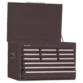 Kennedy 29" 12-Drawer Mechanics Chest - Brown Kennedy Modular drawer cabinet makes the perfect combos for the mechanic who requires maximum storage for all their tools. Ball bearing slides offer smooth operation under head loads. Drawer fronts feature extra large, full width pull handles. High security tubular lock secures all drawers. Powder coat finish. 12-Drawer Mechanic's Chest is made of 18 gauge steel. Includes folding side lift handles. Can be used alone or stacked on Tools Cabinets of matching width (sold separately). Features a reinforced clam shell lid with gas-shock to keep lid open. Brown finish. 30.00 L. 21.00 W. 21.00 H.