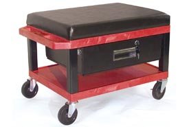 MOBILE MECHANICS SEAT Mechanics Seat Offers a Comfort Padded Top and Secure Storage for Tools and Supplies. Perfect for any garage, workshop, auto body shop and more! This mobile storage stool offers a thick foam padded vinyl covered seat for comfort. 24L x 18W top and bottom shelves are made with thermoplastic resin for strength and corrosion resistance. Top shelf features push handle. Mechanic stool includes 19W x 14-12D x 5H steel locking drawer for secure tool storage. Drawer includes recessed chrome handle and cylinder lock with 2 keys. Garage seat is easy to move on 4 ball bearing swivel casters (2 with brakes).